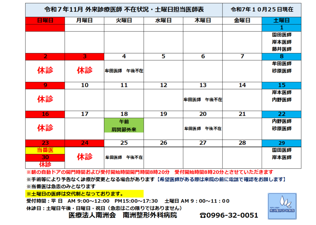 令和7年11月医師不在・土曜日担当医師予定表