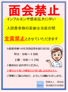2025年12月10日 / 最終更新日 : 2025年12月10日 nanshu-editers お知らせ 入院患者様の面会禁止の案内 インフルエンザ感染拡大に伴い入院患者様の面会は令和7年12月15日より当面の間全面禁止とさせていただきます。入院患者ご家族様には大変ご不便をおかけして申し訳ありませんご理解とご協力のほどよろしくお願いいたします。 Follow me! @Qwy0H8S4mb4H1fx