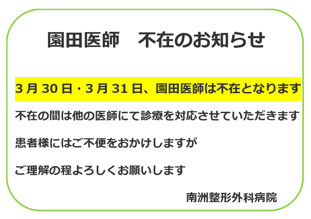 2026年2月28日 / 最終更新日 : 2026年2月28日 nanshu-editers お知らせ 3月30日・31日 園田医師不在のお知らせ 3月30日・31日、園田医師不在となります患者様にはご不便をおかけしますが、ご理解の程よろしくお願いします Follow me! @Qwy0H8S4mb4H1fx