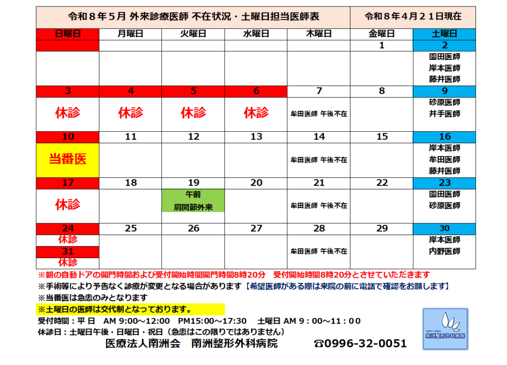2026年4月21日 / 最終更新日 : 2026年4月21日 nanshu-editers お知らせ 令和8年5月医師不在・土曜日担当医師予定表 令和8年5月の医師不在兼土曜日担当医一覧表を作成しました。 診療予定の医師が、手術などで外来を不在となることがありますのであらかじめご来院前に下記の不在日程表もしくはお電話にてご確認ください。 Follow me! @Qwy0H8S4mb4H1fx